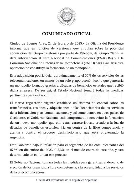 Ciudad de Buenos Aires, 24 de febrero de 2025.- La Oficina del Presidente informa que en función de versiones que circulan sobre la potencial adquisición del Grupo Telefónica por parte de Telecom, del Grupo Clarín, se dará intervención al Ente Nacional de Comunicaciones (ENACOM) y a la Comisión Nacional de Defensa de la Competencia (CNCD) para evaluar si esta operación no constituye la formación de un monopolio.