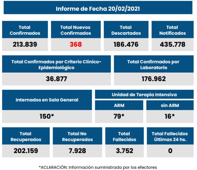 Desde el inicio de la pandemia de coronavirus en la provincia se confirmaron 213.839 casos. De ese número, se recuperaron 202.159 personas; aún cursan enfermedad 7.928 paciente; y se produjeron 3.752 fallecimientos.